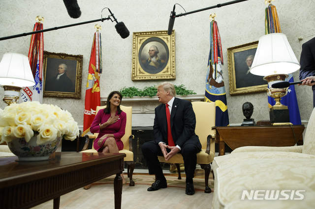 【워싱턴=AP/뉴시스】도널드 트럼프 미국 대통령과 니키 헤일리 유엔주재 미국 대사가 9일(현지시간) 워싱턴 백악관 오벌 오피스에서 면담하고 있다. 트럼프 대통령은 면담 후 헤일리 대사가 올 연말로 사임한다고 밝혔다. 2018.10.10.