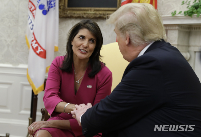 【워싱턴=AP/뉴시스】도널드 트럼프 미국 대통령과 니키 헤일리 유엔주재 미국 대사가 9일(현지시간) 워싱턴 백악관 오벌 오피스에서 이야기하고 있다. 트럼프 대통령은 이날 면담 후 헤일리 대사가 올 연말 사임한다고 발표했다. 2018.10.10.