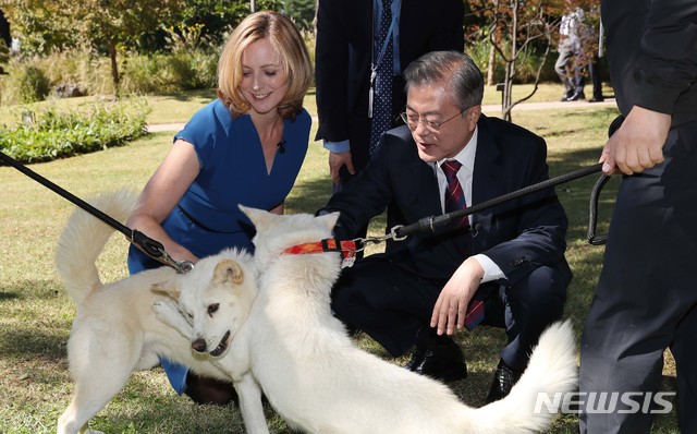 【서울=뉴시스】전신 기자 = 문재인 대통령이 12일 청와대에서 영국 BBC와 인터뷰하며 풍산개 곰이와 송강이를 소개하고 있다. 2018.10.12. (사진=청와대 제공)