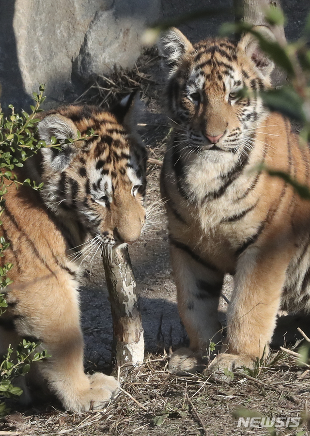 【과천=뉴시스】최진석 기자 = 12일 경기도 과천 서울대공원 동물원에서 지난 5월2일 태어난 새끼 시베리아 호랑이 4마리가 공개되고 있다.