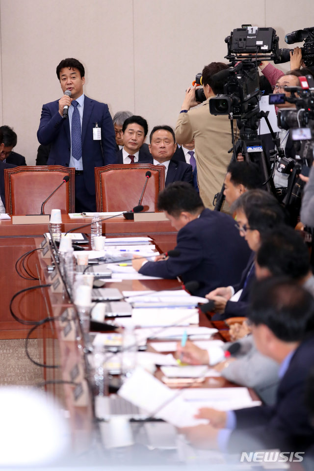 【서울=뉴시스】고승민 기자 = 12일 오후 서울 여의도 국회에서 열린 산업통상자원중소벤처기업위원회의 중소벤처기업부 국정감사에서 참고인으로 출석한 백종원 더본코리아 대표가 더불어민주당 백재현 의원 질의에 답하고 있다. 2018.10.12.