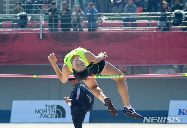 【익산=뉴시스】김얼 기자= 제99회 전국체육대회가 한창인 14일 전북 익산시 익산종합경기장에서 높이뛰기 김여경 선수(전북, 전북체고)가 힘차게 도약하고 있다. 2018.10.14