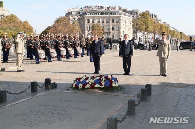 【파리(프랑스)=뉴시스】전신 기자 = 문재인 대통령이 15일(현지시간) 프랑스 파리 개선문 광장에서 열린 공식환영식에서 무명 용사의 묘에 헌화한 후 '꺼지지 않는 불'에 참배하고 있다. 2018.10.16. (사진=청와대 제공)