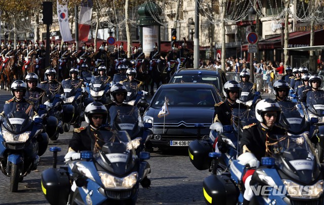 【파리(프랑스)=뉴시스】전신 기자 = 문재인 대통령이 15일(현지시간) 프랑스 파리 샹젤리제 거리에서 프랑스 기마대와 경찰차량의 호위를 받으며 대통령궁으로 이동하고 있다. 2018.10.16.