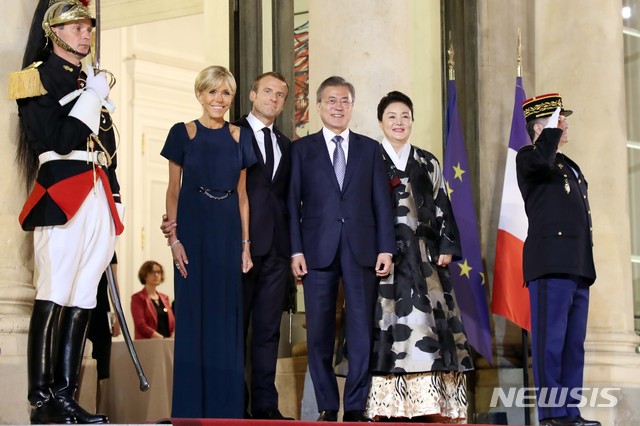 【파리(프랑스)=뉴시스】전신 기자 = 문재인 대통령과 부인 김정숙 여사가 15일(현지시간) 프랑스 파리 대통령궁에서 열린 국빈만찬에 참석하며 에마뉘엘 마크롱 프랑스 대통령 내외와 기념촬영하고 있다. 2018.10.16.