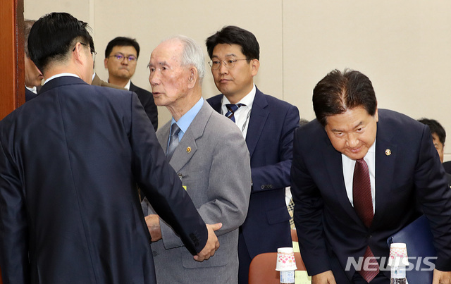 【서울=뉴시스】이종철 기자 = 16일 오후 서울 여의도 국회에서 열린 정무위원회의 국민권익위원회, 국가보훈처, 한국보훈복지의료공단, 독립기념관, 88관광개발(주) 국정감사에서 참고인으로 출석한 탈북 국군포로 유영복씨와 증인으로 출석한 서주석 국방부차관이 국감장을 떠나고 있다. 2018.10.16.