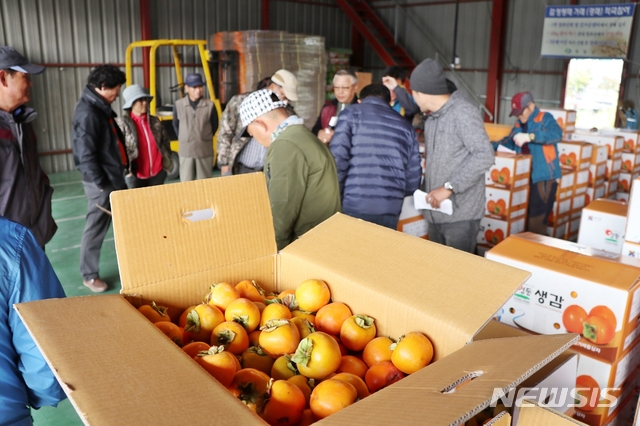 【영동=뉴시스】이성기 기자 = 17일 오전 충북 영동군 영동읍 부용리 중앙청과에서 투명하고 공정한 감 거래를 위한 20㎏ 정량제 경매가 진행되고 있다.2018.10.18(사진=영동군 제공)