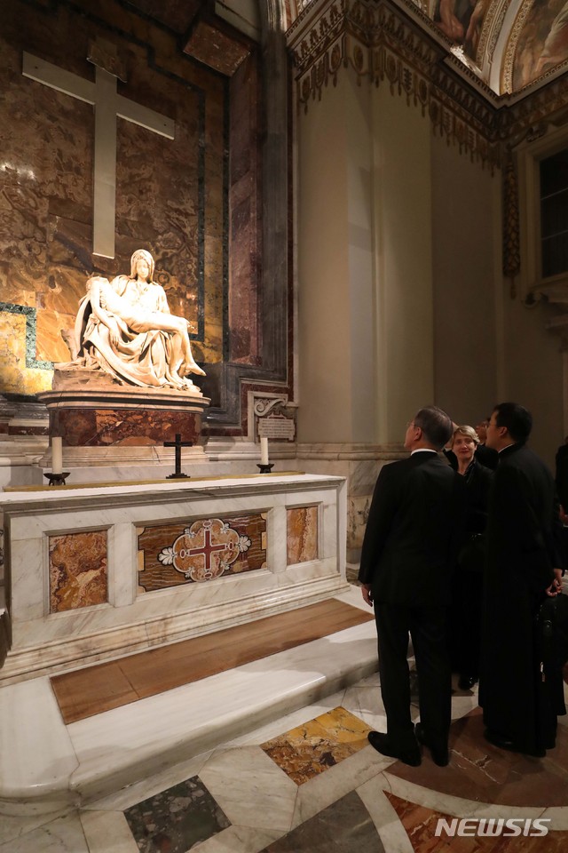 【바티칸=뉴시스】전신 기자 = 문재인 대통령이 17일(현지시간) 로마 바티칸 성 베드로 성당에서 열린 '한반도 평화를 위한 특별미사'를 마친 후 피에타 상을 바라보고 있다. 2018.10.18.