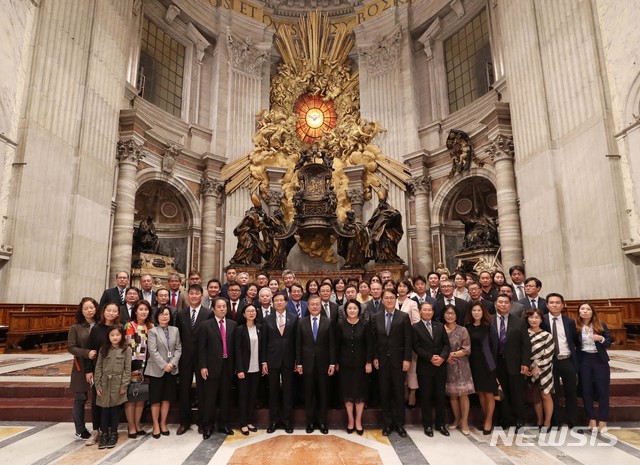 【바티칸=뉴시스】전신 기자 = 문재인 대통령이 17일(현지시간) 로마 바티칸 성 베드로 성당에서 열린 '한반도 평화를 위한 특별미사'를 마친 후 참석자들과 기념촬영하고 있다. 2018.10.18.