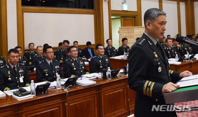 【계룡=뉴시스】함형서 기자= 18일 오전 충남 계룡시 계룡대에서 열린 국회 국방위원회 육군본부 국정감사에서 김용우 육군참모총장이 인사말을 하고 있다.. 2018.10.18.