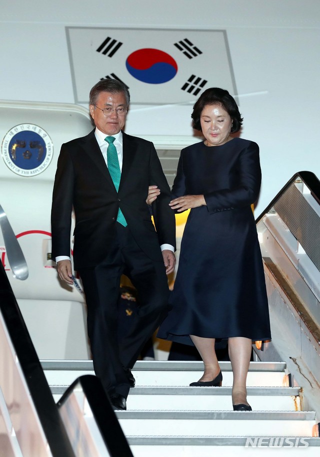 【브뤼셀(벨기에)=뉴시스】전신 기자 = 문재인 대통령과 부인 김정숙 여사가 18일(현지시간) 브뤼셀 멜스부르크 공군기지에 도착해 트랩을 내려오고 있다. 2018.10.19.