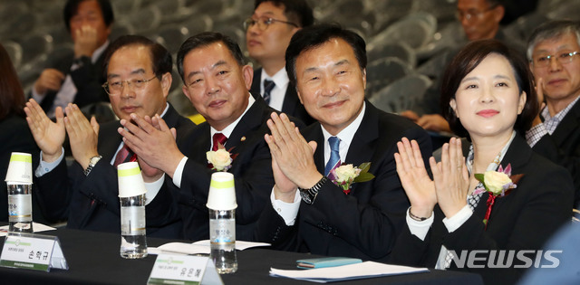 【고양=뉴시스】홍효식 기자 = 유은혜(오른쪽부터) 사회부총리 겸 교육부장관, 바른미래당 손학규 대표, 이찬열 국회 교욱위원장, 하윤수 한국교총 회장이 19일 오전 경기 고양 일산서구 킨텍스 제2전시장에서 열린 제2회 교육대전 '대한민국 초·중·고 교장단 합동연수회'에 참석해 박수를 보내고 있다. 2018.10.19.