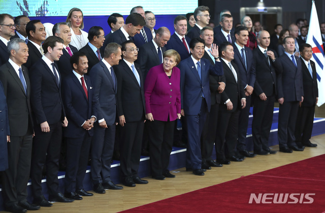 【브뤼셀=AP/뉴시스】유럽연합(EU)과 아시아 국가 정상들이 19일(현지시간) 벨기에 브뤼셀에서 제12차 아셈 정상회의에 참석해 기념촬영을 하고 있다. 이들은 회의에서 무역, 기후변화, 이란 핵합의 등 다양한 국제 이슈에 대해 논의했다. 2018.10.20.