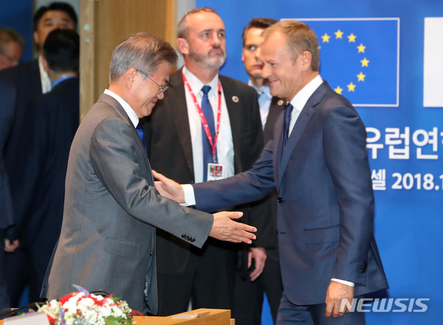 【브뤼셀(벨기에)=뉴시스】전신 기자 = 문재인 대통령이 19일(현지시간) 브뤼셀 유로파 빌딩에서 도날드 투스크 EU 상임의장과 한-EU 확대 정상회담을 하고 있다. 2018.10.19.