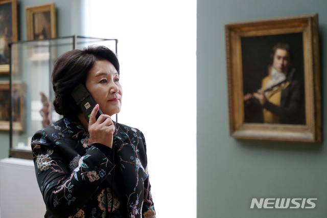 【브뤼셀(벨기에)=뉴시스】전신 기자 = 문재인 대통령 부인 김정숙 여사가 19일(현지시간) 브뤼셀 왕립미술관에서 열린 한국어 오디오가이드 개시식을 마친 후 기기를 통해 작품 설명을 듣고 있다. 2018.10.20.