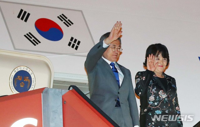【코펜하겐(덴마크)=뉴시스】전신 기자 = 문재인 대통령과 부인 김정숙 여사가 19일(현지시간) 코펜하겐 카스트룹 국제공항에 도착해 손 흔들어 인사하고 있다. 2018.10.20.