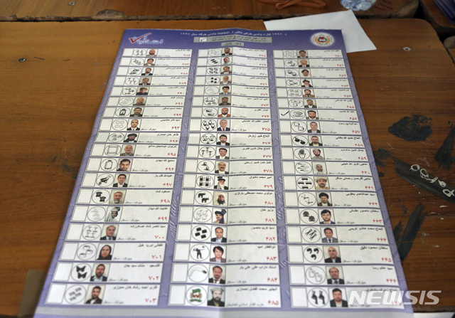 【카불=AP/뉴시스】 아프간 하원 총선 투표지가 21일 수도 카불 개표장 책상위에 놓여 있다. 수십 명 후보 중 한 명에게 체크 표시가 되어 있다. 249명 선출에 2500여 명이 출마했으며 여성도 420명 포함됐다. 내전 18년째인 아프간 수도에서 질서있게 내걸린 선거 포스터를 볼 수 있었지만 아직 정당 대신 인물 본위 선거로 무소속이 대부분이다. 2018. 10. 21