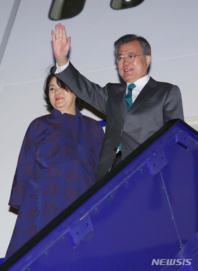 【코펜하겐(덴마크)=뉴시스】전신 기자 = 유럽 순방을 마치고 귀국하는 문재인 대통령과 부인 김정숙 여사가 20일(현지시간) 코펜하겐 카스트룹 국제공항에 도착해 손 흔들어 인사하고 있다. 2018.10.21.