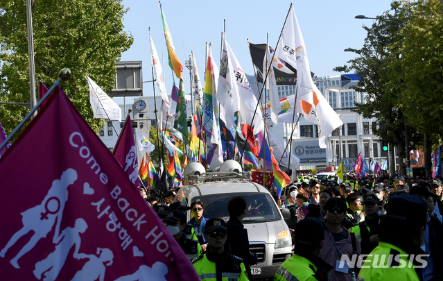【광주=뉴시스】신대희 기자 = 21일 오후 광주 동구 5·18민주광장에서 제1회 광주 퀴어문화축제가 열리고 있는 가운데, 참가자들이 행진하고 있다. 이번 행사는 성 소수자들이 정체성을 표현하고 다양성을 존중해달라는 취지로 마련됐다. 2018.10.21.