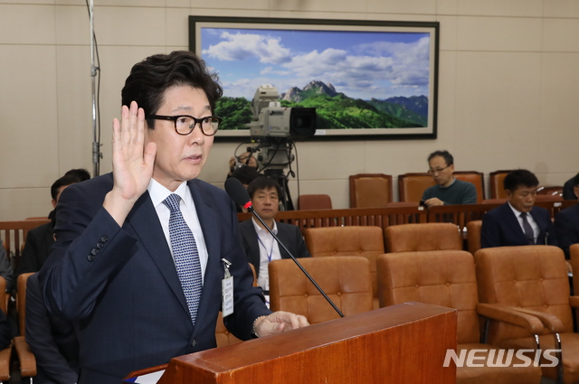 【서울=뉴시스】고승민 기자 = 23일 오후 서울 여의도 국회에서 열린 환경노동위원회의 조명래 환경부 장관 후보자 인사청문회에서 조 후보자가 선서를 하고 있다. 2018.10.23. [email protected]