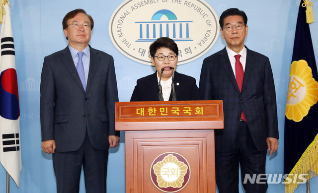 【서울=뉴시스】박영태 기자 = 임이자 국회 환경노동위원회 자유한국당 간사를 비롯한 환경노동위원회 자유한국당 의원들이 24일 서울 영등포구 여의도 국회 정론관에서 조명래 환경부장관 후보자 청문보고서 채택 거부를 주장하며 기자회견을 하고 있다. 왼쪽부터 강효상, 임이자, 문진국 의원. 2018.10.24.