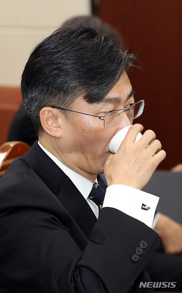 【서울=뉴시스】이종철 기자 = 24일 오후 서울 여의도 국회에서 열린 보건복지위원회의 한국보건의료인국가시험원, 국립중앙의료원, 한국보건의료연구원, 한국의료분쟁조정중재원의 국정감사에 참고인으로 출석한 이국종 교수가 의물을 마시고 있다. 2018.10.24.