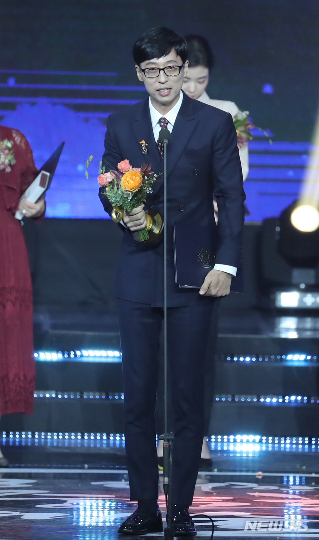 【서울=뉴시스】조수정 기자 = 2018 대한민국 대중문화예술상 시상식이 열린 24일 오후 서울 송파구 방이동 올림픽공원 올림픽홀에서 개그맨 유재석이 대통령 표창을 수장한 뒤 소감을 밝히고 있다. 2018.10.24. [email protected]