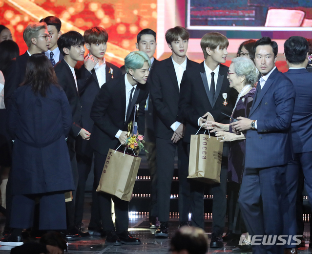【서울=뉴시스】조수정 기자 = 2018 대한민국 대중문화예술상 시상식이 열린 24일 오후 서울 송파구 방이동 올림픽공원 올림픽홀에서 화관문화훈장을 수훈한 그룹 방탄소년단이 보관문화훈장을 수훈한 배우 김영옥에게 인사하고 있다. 왼쪽 끝부터 RM, 제이홉, 정국, 지민, 진, 뷔. 2018.10.24. [email protected]