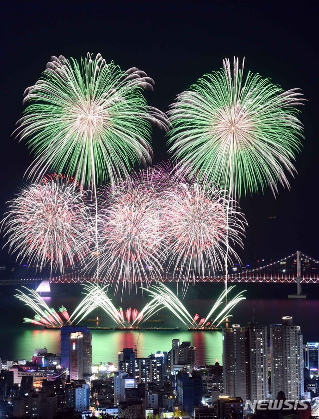 【부산=뉴시스】 하경민 기자 = '제14회 부산불꽃축제'가 열린 27일 부산 수영구 광안리해수욕장 앞바다에서 화려한 불꽃쇼가 펼쳐지고 있다.