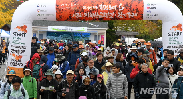 【서울=뉴시스】최진석 기자 = 산림청이 지리산둘레길 10주년을 기념해 27일 경상남도 함양군 마천면에서 '제8회 지리산둘레길 걷기축제'를 개최한 가운데 김재현 산림청장 등 참가자들이 둘레길을 출발하고 있다. 2018.10.28. (사진=산림청 제공)