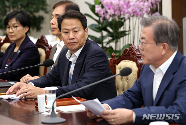 【서울=뉴시스】박진희 기자 = 임종석 대통령 비서실장이 29일 오후 청와대 여민관에서 열린 수석·보좌관 회의에 참석하여 문재인 대통령 발언을 경청하고 있다. 2018.10.29.