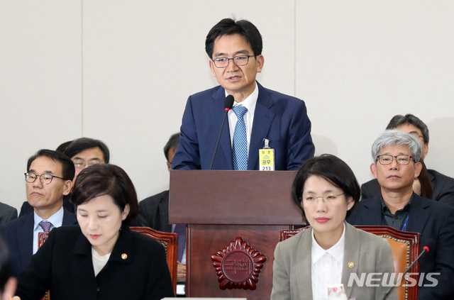 【서울=뉴시스】박영태 기자 = 29일 서울 영등포구 여의도 국회에서 열린 국회 교육위원회의 교육부, 그 소속기관, 공공기관 및 유관기관에 대한 오후 종합 국정감사에서 이덕선 한국유치원총연합회 비대위원장이 의원 질의에 답변하고 있다. 2018.10.29.