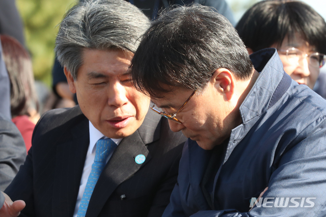 【군산=뉴시스】박진희 기자 = 장하성 정책실장과 윤종원 경제수석이 30일 전북 군산시 유수지 수상태양광부지에서 열린 '새만금 재생에너지 비전 선포식'에서 대화하고 있다. 2018.10.30.