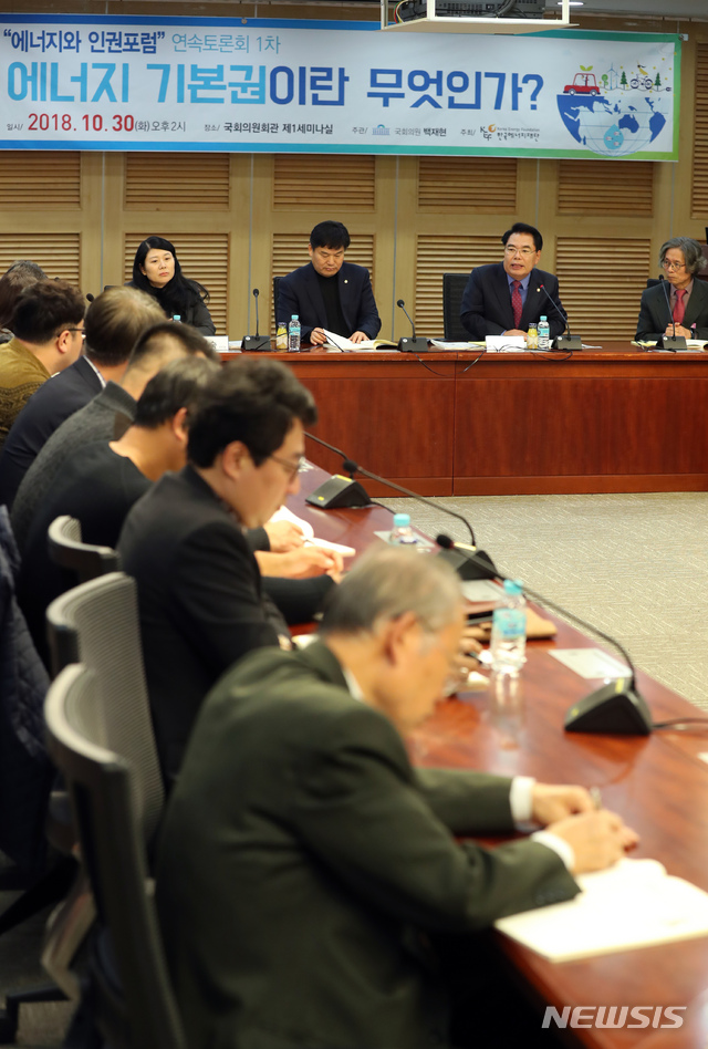 【서울=뉴시스】고승민 기자 = 30일 오후 서울 여의도 국회 의원회관에서 더불어민주당 백재현 의원 주관, 한국엥너지재단 주최로 열린 '에너지와 인권포럼, 에너지 기본권이란 무엇인가' 연속토론회에서 백재현 의원이 인사말을 하고 있다. 2018.10.30.