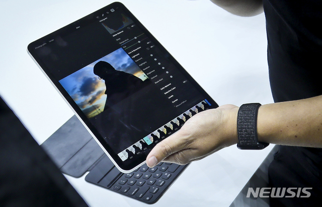 【뉴욕=AP/뉴시스】 30일(현지시간) 미국 뉴욕 브루클린에서 열린 애플 신제품 공개 행사에서 한 참석자가 새 '아이패드 프로'를 살펴보고 있다. 2018.10.31