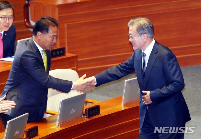 【서울=뉴시스】 고승민 기자 = 문재인 대통령이 1일 오전 서울 여의도 국회 본회의장에서 2019년도 예산안 관련 시정연설을 마치고 이용주 의원과 악수하고 있다. 2018.11.01.