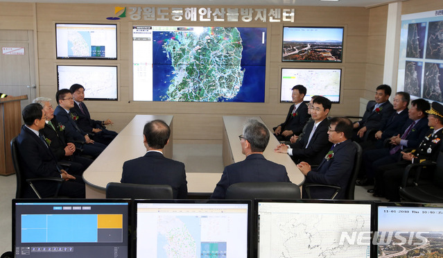 【강릉=뉴시스】김경목 기자 = 1일 강원 강릉시 주문진읍 국립수산과학원 동해수산연구소 양식기술지원센터에 임시 사무실을 마련한 '강원도 동해안산불방지센터' 개소식이 열린 가운데 최문순 강원도지사, 김재현 산림청장, 김철수 속초시장, 김양호 삼척시장 등 센터 참여기관의 대표들이 담소를 나누고 있다. 2018.11.01. (사진=강원도청 제공)