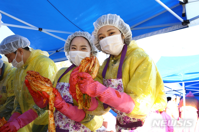 【서울=뉴시스】OK저축은행이 3일 안산 상록수 체육관에서 'OK 저축은행 연말 사회공헌 대축제'를 개최했다. 사랑의 김장 나눔 행사를 위해 참여한 직원들이 김치를 들어올리며 웃어 보이고 있다. (사진 = OK저축은행)