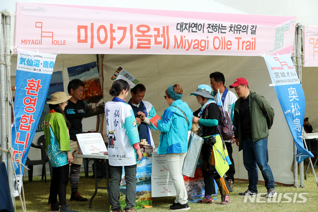 【서귀포=뉴시스】우장호 기자 = 2018 제주올레걷기축제 마지막 날인 3일 오후 제주 서귀포시 서홍동 칠십리시공원에서 일본 미야기현 '미야기 올레(Miyagi Olle Trail)' 관계자들이 부스를 마련해 올레꾼들에게 사케를 대접하고 '치유의 길 미야기올레'를 홍보하고 있다.