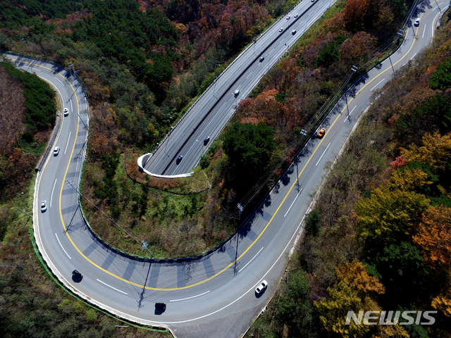 【강릉=뉴시스】김경목 기자 = 가을이 깊어가고 있는 4일 오후 강원 강릉시 성산면 영동고속도로(터널 구간)와 대관령 옛 도로(지방도 456호선)를 따라 차들이 이동하고 있다. 2018.11.04.