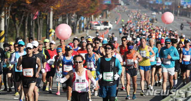 【서울=뉴시스】최진석 기자 = 4일 '2018 jtbc 서울마라톤'이 서울 잠실 ~ 경기도 성남시 구간에서 2만여명의 선수들이 참가한 가운데 개최됐다. 대회우승은 아세파 니게우(에티오피아) 선수가 2시간8분11초로 차지했다. 2018.11.04. (사진=중앙일보 제공)