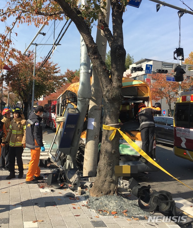 【울산=뉴시스】구미현 기자 = 5일 오후 12시45분께 울산시 울주군 범서읍 구영리 구영주유소 앞 4차선 도로에서 시내버스가 승용차를 피하려다 전신주를 들이받았다. 이 사고로 탑승객 17명이 부상을 입어 인근 병원 등에서 치료를 받고 있다. 2018.11.05. (사진=울산 중부소방서 제공)