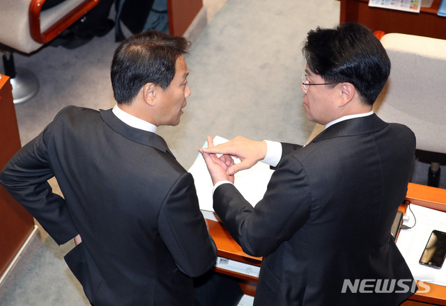 【서울=뉴시스】박영태 기자 = 5일 오전 서울 영등포구 여의도 국회에서 열린 국회 예산결산위원회 전체회의에서 임종석 대통령 비서실장이 장제원 예결위 자유한국당 간사와 이야기를 나누고 있다. 2018.11.05.