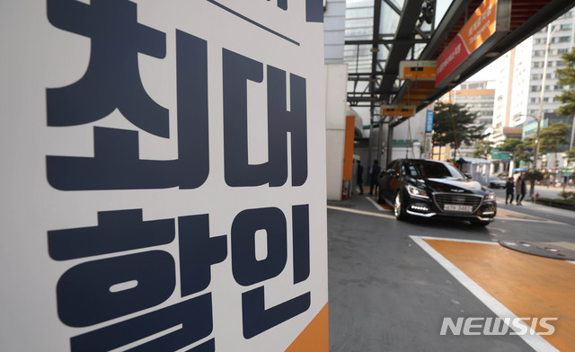 【서울=뉴시스】추상철 기자 = 휘발유 경유 등에 대한 유류세 15% 한시적 인하를 하루 앞둔 5일 오후 서울 중구 주유소에는 '최대할인'이라는 안내 문구가 게시돼 있다. 2018.11.05.