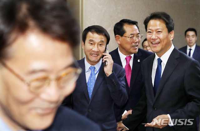 【서울=뉴시스】이종철 기자 = 6일 서울 여의도 국회 의원회관에서 열린 국회운영위 국정감사에 출석하는 임종석 대통령비서실장이 밝은 표정으로 입장하고 있다. 왼쪽은 경질 이야기가 나오는 장하성 정책실장. 2018.11.06.