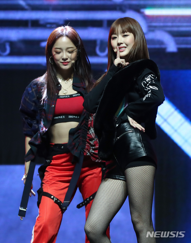 【서울=뉴시스】조수정 기자 = 그룹 구구단 세정, 미미(오른쪽)가 6일 오후 서울 광장동 예스이십사라이브홀에서 세번째 미니앨범 '뉴 액션(New Action)' 발매 기념 쇼케이스를 열고 수록곡 '비 마이셀프(Be Myself)를 선보이고 있다. 2018.11.06. [email protected]