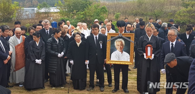 【영천=뉴시스】박준 기자 = 7일 오전 경북 영천시 괴연동 630번 성일가에서 고(故) 배우 신성일의 추도식이 열렸다. 추도식 전 진행된 하관식의 모습. 2018.11.07