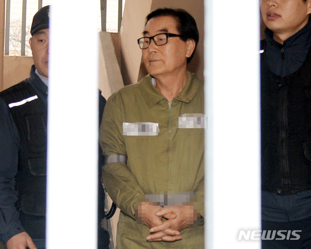 【전주=뉴시스】김얼 기자= 골프장 인허가 확장 과정에서 뇌물 수수 혐의를 받던 전 전라북도 최규호 교육감이 도주 8년 만에 검거된 7일 전북 전주시 전주지방검찰청에서 검찰 관계자들이 최규호 교육감을 호송차로 송치하고 있다. 2018.11.07