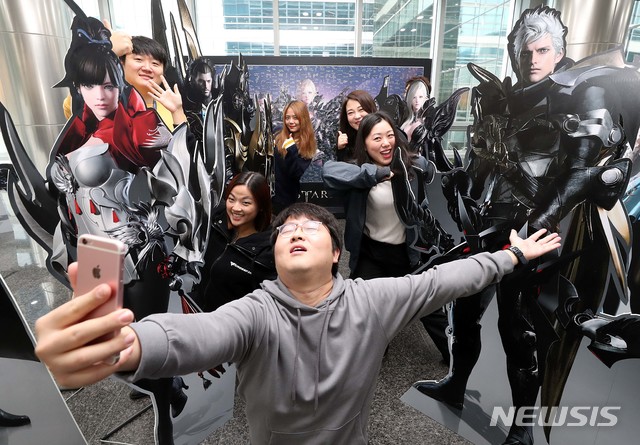 【서울=뉴시스】 글로벌 엔터테인먼트 기업 스마일게이트가 기대작인 ‘로스트아크’의 서비스 오픈을 하루 앞둔 6일 경기도 성남시 분당구 본사 1층 로비에서 ‘로스트아크 성공 기원 행사’를 진행했다. 스마일게이트 직원들이 포토존에서 기념사진을 찍으며 ‘로스트아크’의 론칭을 축하하고 있다. 2018.11.07. (사진=스마일게이트 제공)