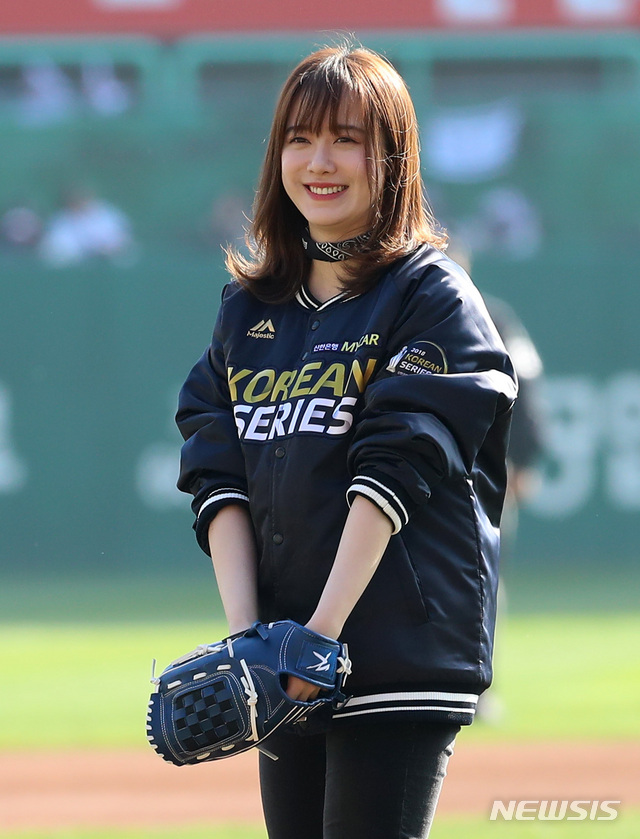 【인천=뉴시스】이영환 기자 = 10일 오후 인천 미추홀구 SK행복드림구장에서 열린 2018 KBO 한국시리즈 5차전 SK 와이번스와 두산 베어스의 경기, 배우 구혜선이 시구를 하고 있다. 2018.11.10.